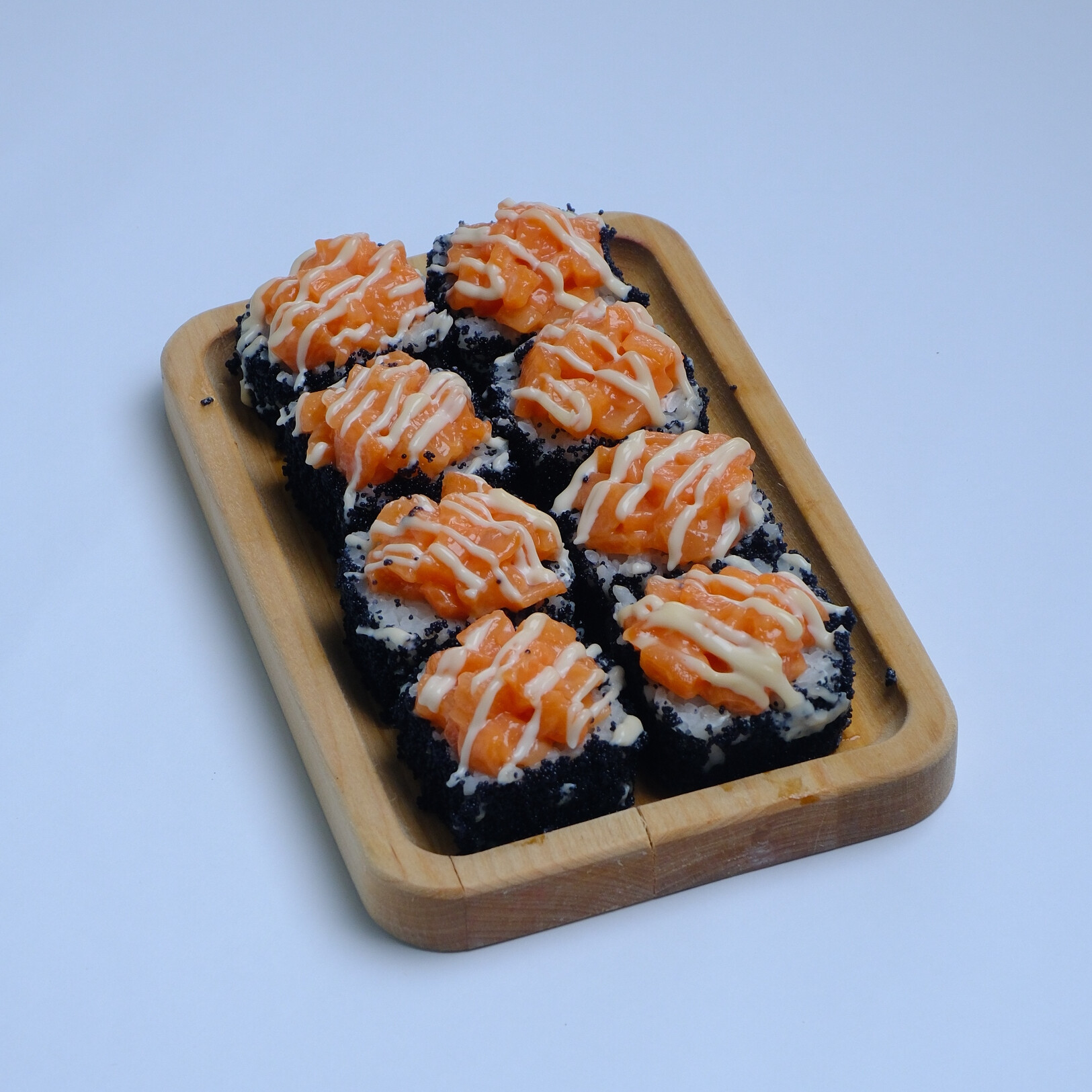 Рис, нори, лосось, огурец, твороженный сыр, тобико, чили соус, майонез.