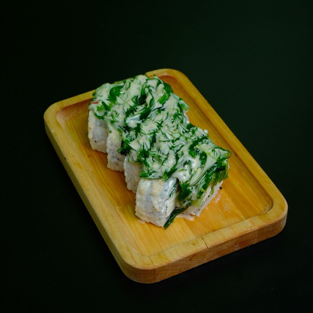 Рис, нори, творожный сыр, огурец, лосось, чука, ореховый соус.
