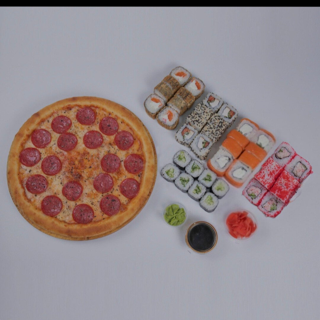 32 кусочка, Аляска, Калифорния темпура, Филадельфия лайт, Каппа маки, пицца Пепперони 30 см.