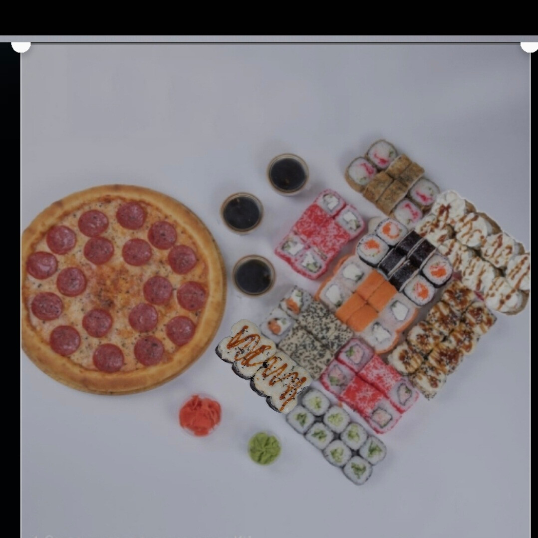 80 кусочков. Филадельфия лайт, Каппа маки, Аляска, Калифорния, Подснежник, Чикен хот, Калифорния темпура, Сансара, Бостон, Кимбаб, пицца Пепперони 30 см.
